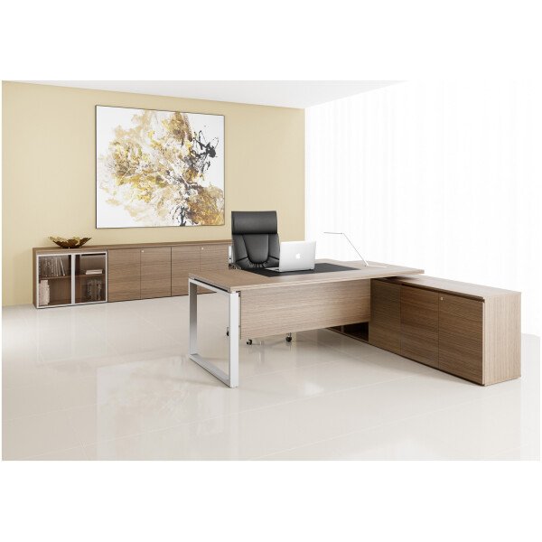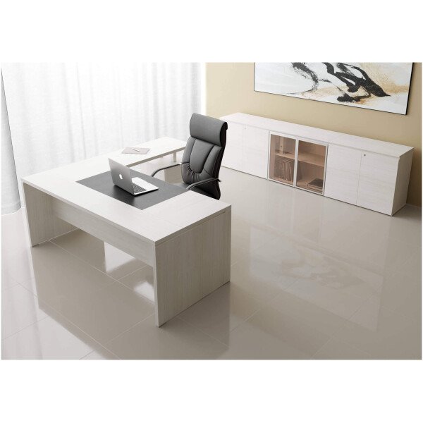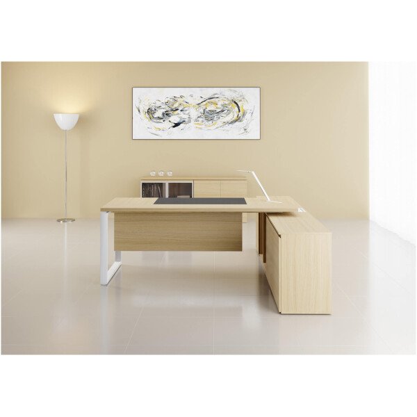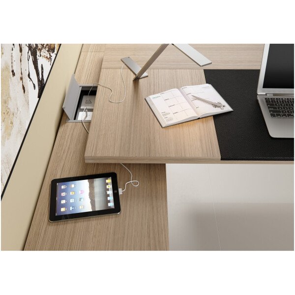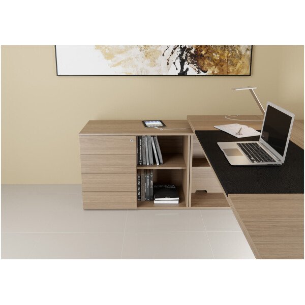 Ziehbar se presenta en varias combinaciones en gamas de colores claros y oscuros en melaminas de alta resistencia de 36 mm y bordes soft de ABS en 2 mm. Las uniones entre tapas, laterales y frentes se encuentran separadas por medio de distanciadores de aluminio macizo anodizado con el grabado de la marca; Los mismos elementos son utilizados como regatones en la parte inferior con una felpa deslizante. La línea cuenta con una alternativa enchapada en madera natural con lustre poliuretánico, dirigida a los más exquisitos. El espacio central del escritorio esta dominado por un inserto en ecocuero que aporta calidez y diseño, éste puede combinarse con el tapizado del sillón.